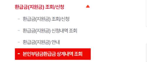 2. 개인민원 메뉴에 환급금(지원금) 조회/신청에서 환급금 조회 및 신청이 가능합니다. 제일아래 목록에서는 본인부담금환급금 상계내역 조회가 가능합니다.
