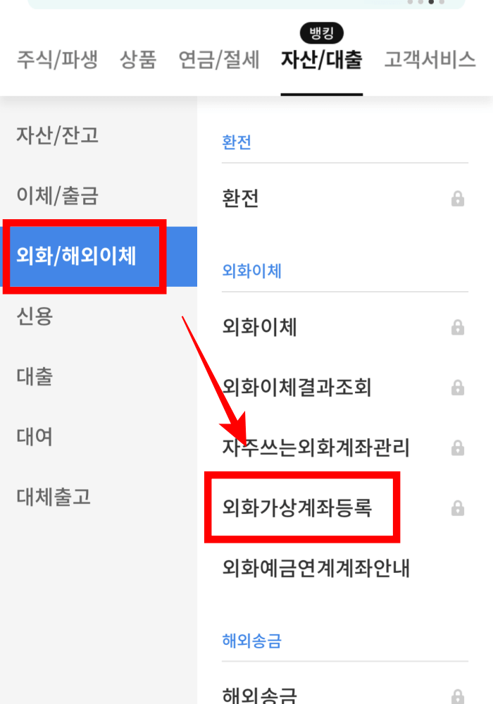 메뉴에 들어가서 외화/해외이체에 들어간 후에 중간쯤에 '외화가상계좌등록' 하위메뉴를 확인할 수 있는데요. 앞서 이야기한 것처럼 외화가상계좌 등록을 해야 하는데, 여기에서 진행하면 됩니다.