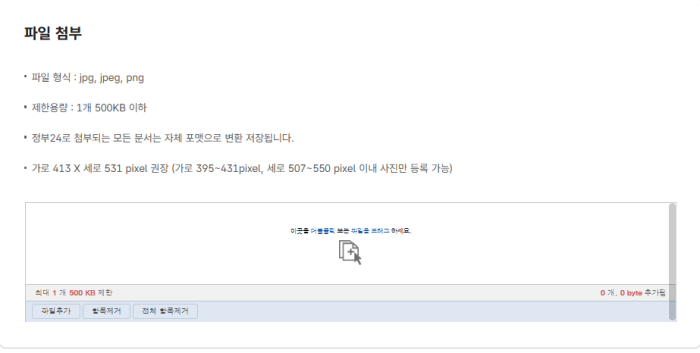 - 가로 395~431 pixel, 세로 507~550 pixel 이내 범위 사진으로만 신청이 가능