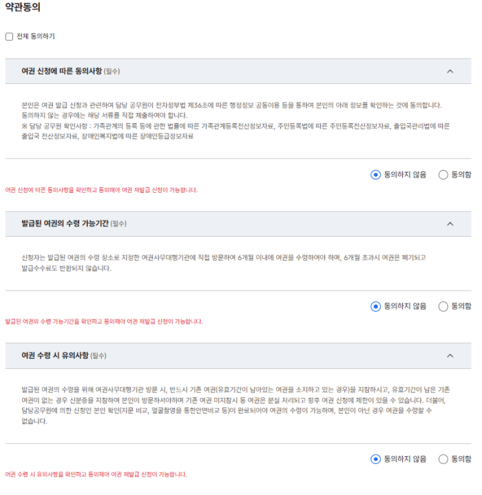 꼭 알아야 하는 내용으로는 여권 수령은 6개월 이내에 직접 방문해서 수령해야 한다, 여권 수령 주의사항 등이 있습니다. 길지 않으니 모두 한 번씩 읽어본 후 동의하세요.
