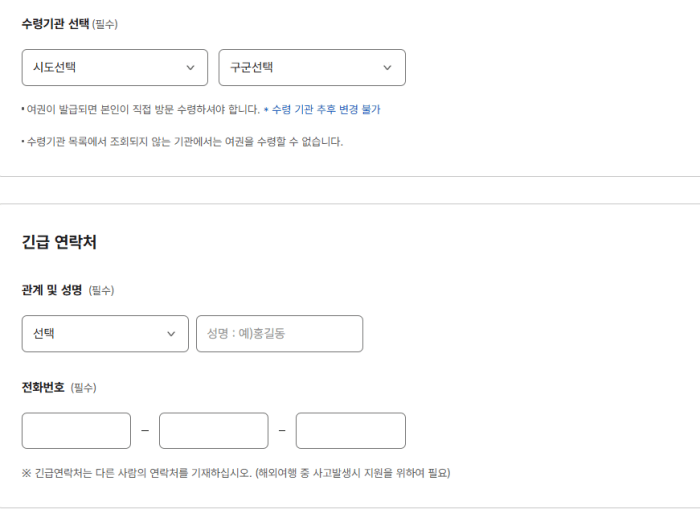 아래로 내리면 수령기관 선택란이 있습니다. 여권을 온라인으로 신청하더라도 수령을 위해 여권발급 기관에 한 번은 방문해야 합니다. 추후 변경 불가하므로 잘 확인한 후 선택하세요.