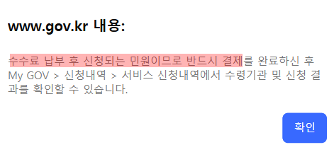 결제를 완료하면 여관 재발급 온라인 신청이 완료됩니다.