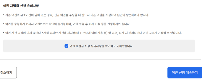 여권 재발급이 가능한 경우에 위와 같은 유의사항이 나옵니다. 체크박스에 확인한 후에 '여권 신청 계속하기'를 눌러주세요.