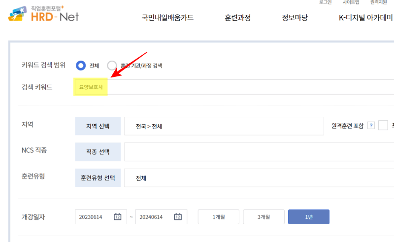 내일배움카드 발급한 사이트(직업훈련포털)에서 훈련과정을 확인하고 수강신청을 진행할 수 있습니다. 상단 키워드에 요양보호사를 입력하고 교육을 받을 지역을 선택한 후에 조회하면 관련 내용을 확인할 수 있습니다.