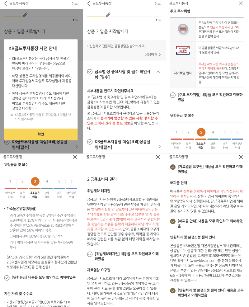다음으로 상품 가입 절차입니다. 금투자는 일반 예적금과는 달리 손실 위험이 있는 것이기 때문에 그러한 사항을 고지해 주고 있습니다. 하지만 금투자는 장기적으로 봤을 때 안전자산에 더 가깝습니다.