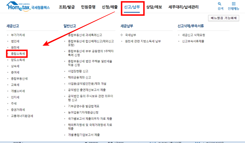 홈택스로 신청을 하는 경우에는  제일 먼저 신고/납부 탭을 눌러 종합소득세를 선택합니다.