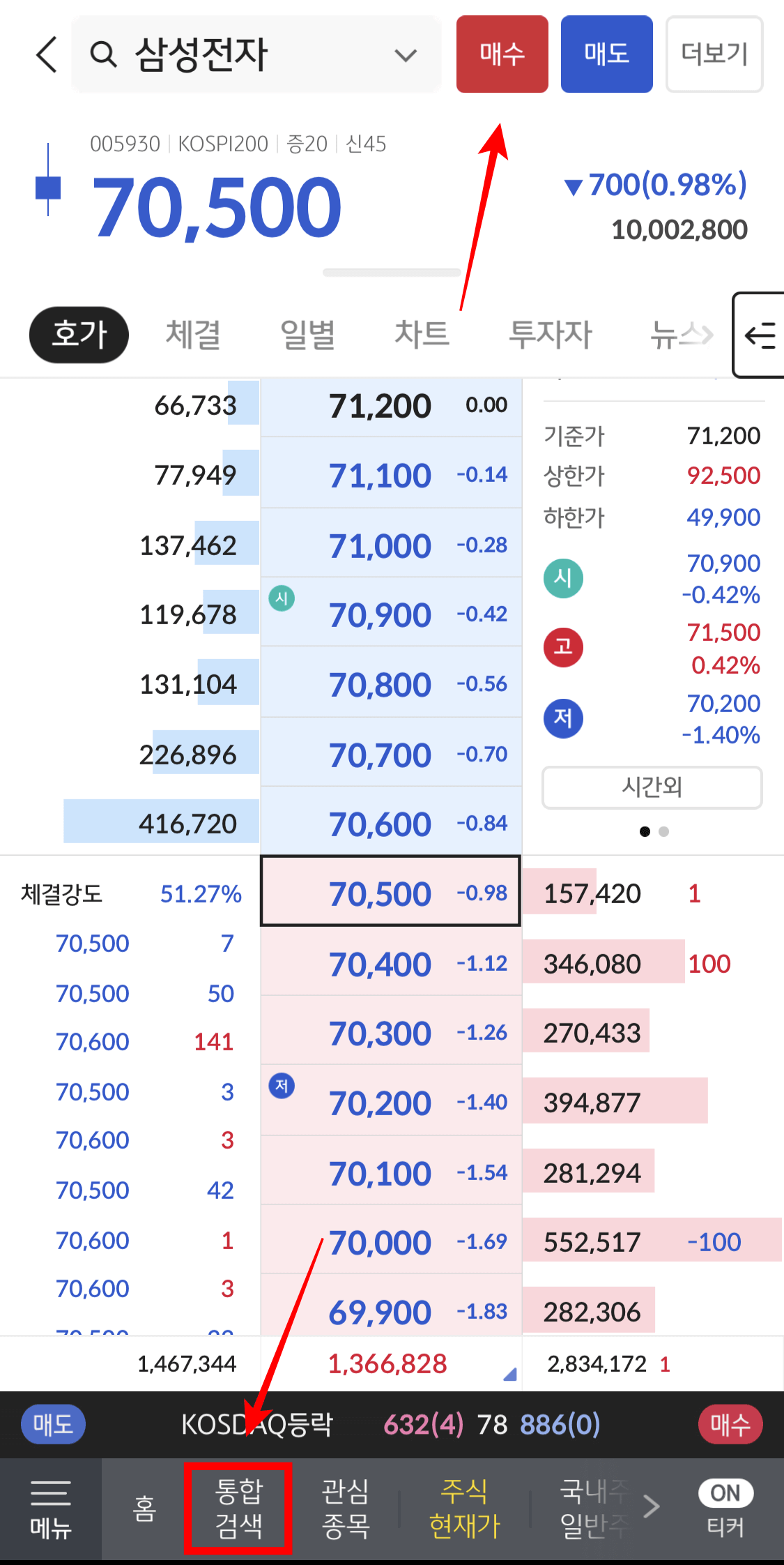 다른 방법으로는 통합검색에서 삼성전자를 검색한 후 선택하면 위와 같은 화면이 나오는데 여기에서 상단에 있는 매수를 선택해도 됩니다.