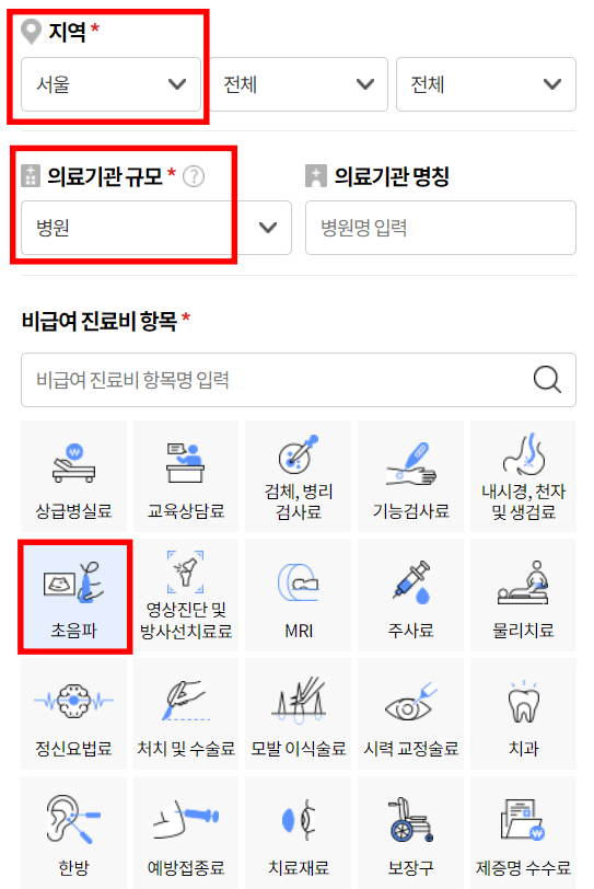 그다음에 초음파 아이콘을 선택하여 상세 분류를 확인한 후에 체크하면 자세한 가격 정보를 확인할 수 있습니다.