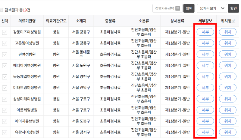 예를 들어 지역: 서울, 의료기관 규모-병원, 임산부-제1삼분기 초음파을 선택하면 위와 같은 화면을 확인할 수 있는데요. 여기에서 세부정보 아이콘을 선택하면 정확한 초음파 가격 정보를 확인할 수 있습니다.