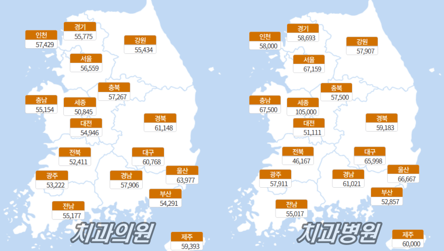 * 지역별 비급여 스케일링 비용은 다음과 같습니다. (왼쪽 치과의원 가격, 오른쪽 치과병원 가격)