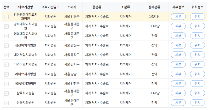 건강보험심사평가원 사이트에 접속하면 스케일링 보험 비적용 가격을 병원별로 확인할 수 있습니다. 지역, 의료기관 규모, 비급여 진료비 항목을 입력하면 위와 같이 치과 정보가 나옵니다. 세부사항을 클릭하면 가격 정보를 확인할 수 있습니다.