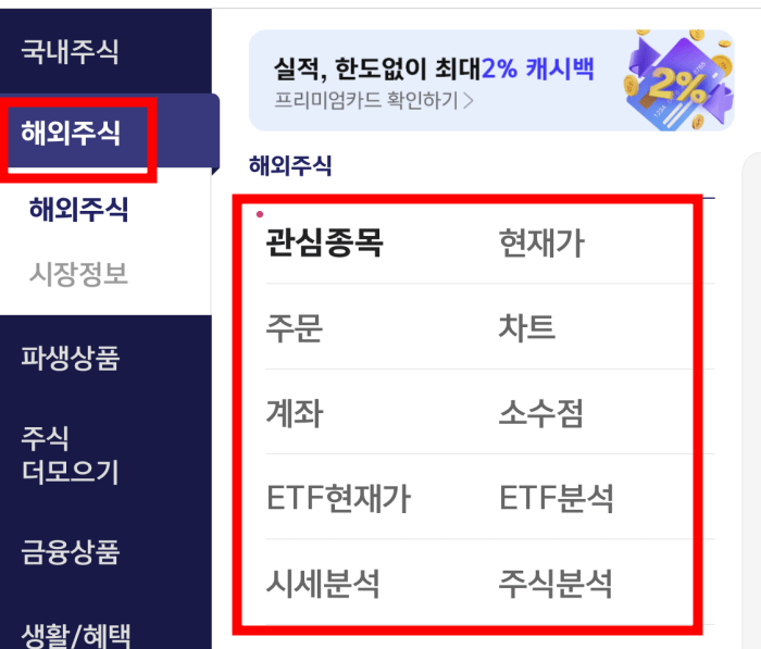 해외주식이 아닌 국내주식으로 나오는 경우,  메뉴(≡)에 들어가서 해외주식-원하는 메뉴를 누르면 관련 내용을 확인 가능합니다.
