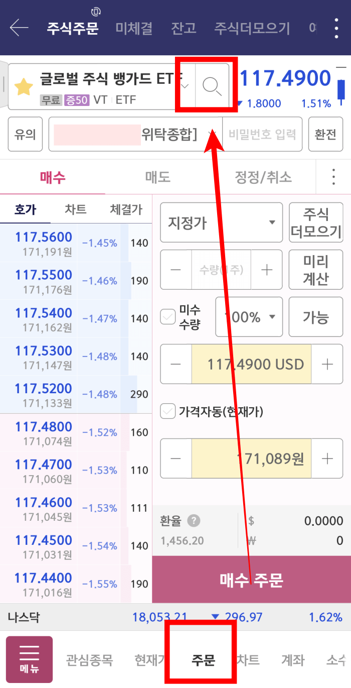 제일 먼저 하단에 있는 주문에 들어가세요. 주문에 들어가면 매수 주문 화면이 나오는데요. 바로 매수를 하는 것이 아니라, VOO 종목을 먼저 찾아야겠죠?  상단에 있는 돋보기 모양을 눌러주세요.