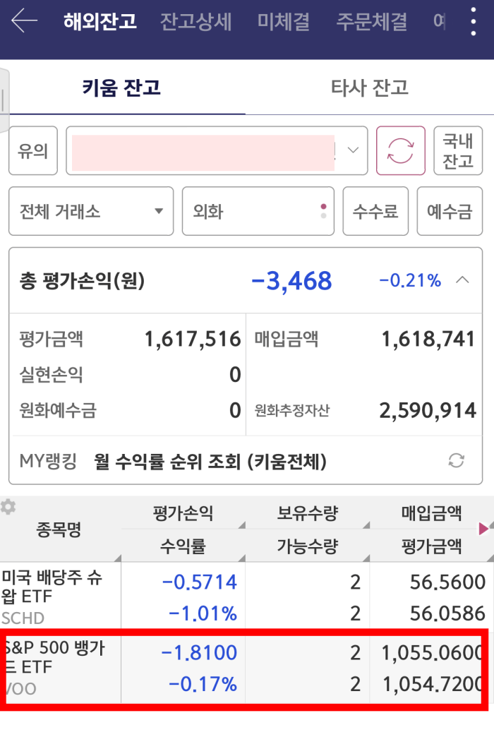 해외잔고에 들어가니 방금 매수한 VOO 종목 2주가 매입된 것을 확인할 수 있습니다. 여기에서 매입금액, 평가금액, 평가손익, 수익률 등 모두 확인이 가능하니까 참고하세요.