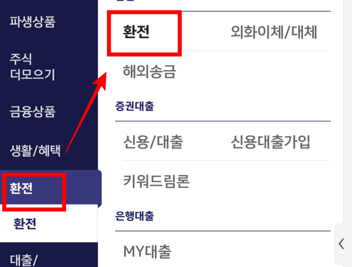 그다음에 환전 > 환전에 들어가면 됩니다. 외화이체와 관련된 메뉴는 그 옆에 외화이체/대체를 이용하면 됩니다. (가상계좌도 여기에서 등록)