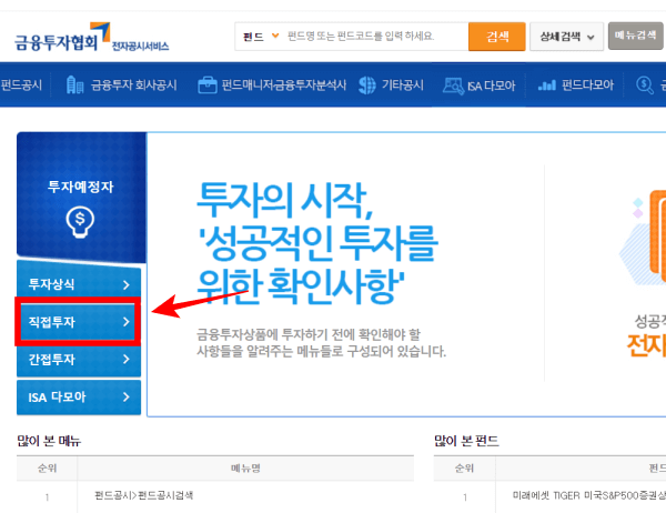 사이트에 들어간 후에 화면 왼편에 있는 직접투자에 들어갑니다.