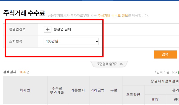 그다음 원하는 증권사를 선택하고(여러 개 선택 가능) 금액을 설정한 후 검색하면 수수료 확인이 가능합니다.