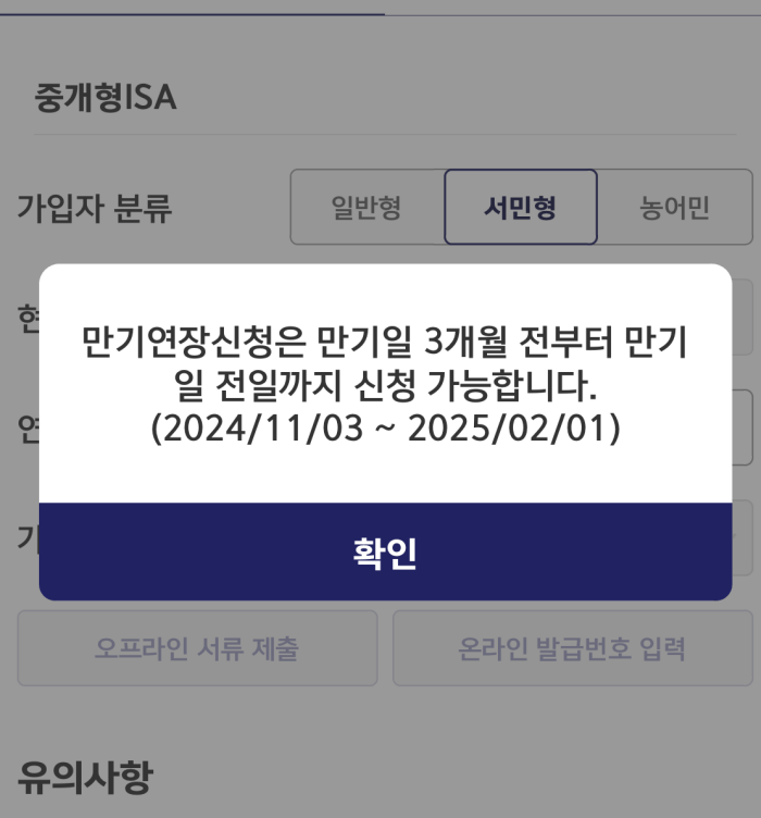 만기연장신청에 들어가면-아직 만기일이 다가오지 않았다면 위와 같이, 3개월 전부터 만기 신청이 가능하다는 문구가 나옵니다. ISA 계좌는 3년 동안 유지해야 하고, 중도 해지 시 세제혜택이 사라집니다.